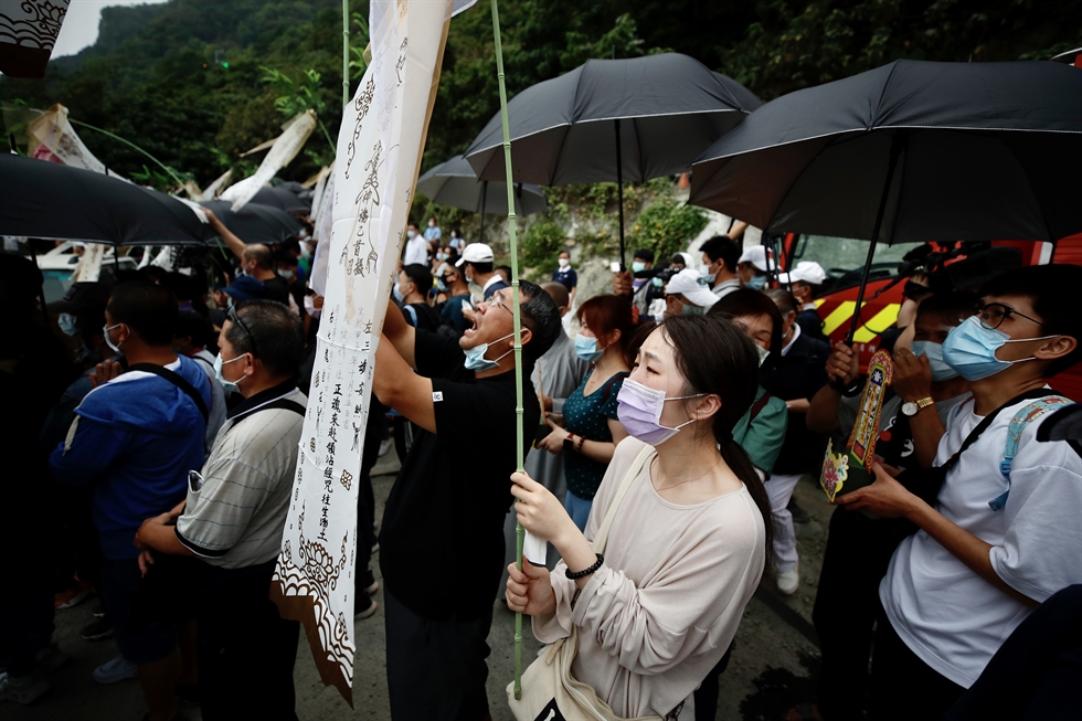 Around one hundred relatives held an emotional Taoist prayer ceremony near the crash site on Saturday afternoon, shaded under a canopy of black umbrellas.